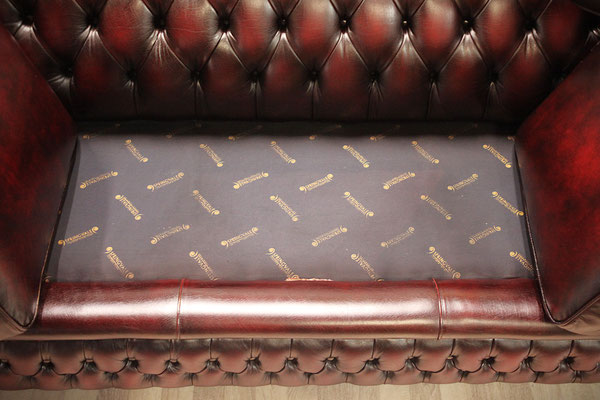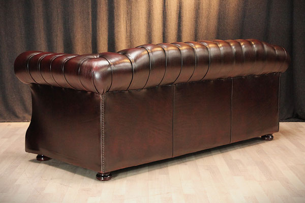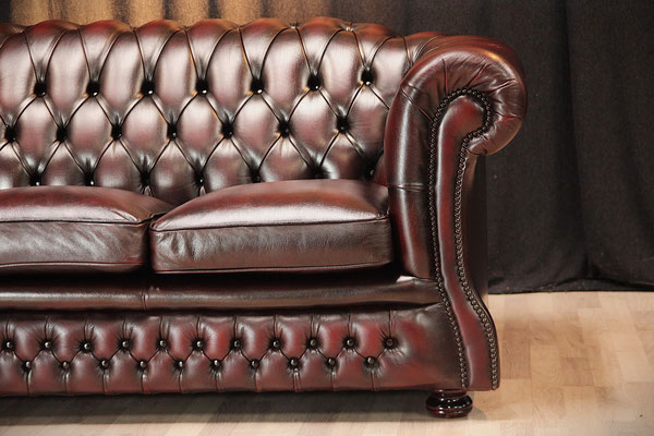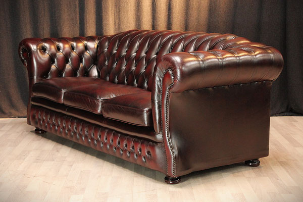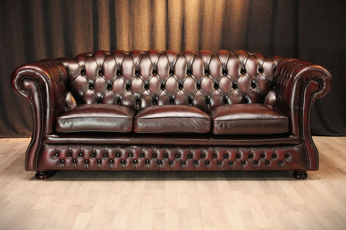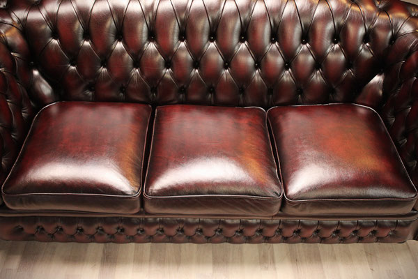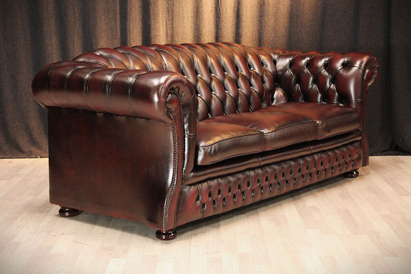 Chesterfield 3er Sofa in Oxblood/Rot. Der mit hochwertigem Rindsleder (echtes Leder) bezogene Sofa kommt aus einem sauberem Nichtraucher Haushalt und befindet sich noch in einem sehr gutem